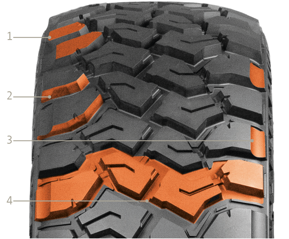 - Los prominentes bloques de los hombros que se prolongan hasta el flanco proporcionan excelentes niveles de tracción, especialmente en situaciones en las que el agarre lateral puede ser difícil de encontrar.
